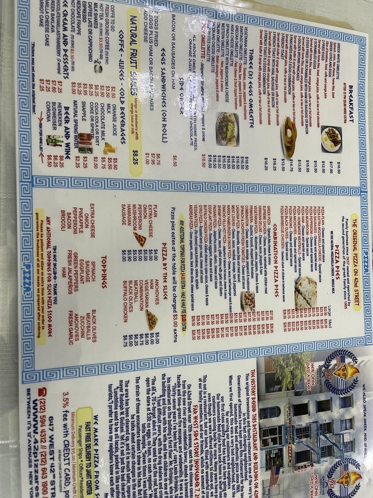 Welcome to 42nd Street Restaurant and Pizza, a delightful eatery where Greek flavors meet beloved comfort food. Located at 647 W 42nd St, New York, this family-owned gem specializes in mouthwatering Greek dishes, pizza, and hearty sandwiches. The menu boasts a variety of vegetarian options alongside classic platters, such as the Greek Gyro Platter and Chicken Souvlaki, both served with fresh Greek salad and irresistible tzatziki sauce.